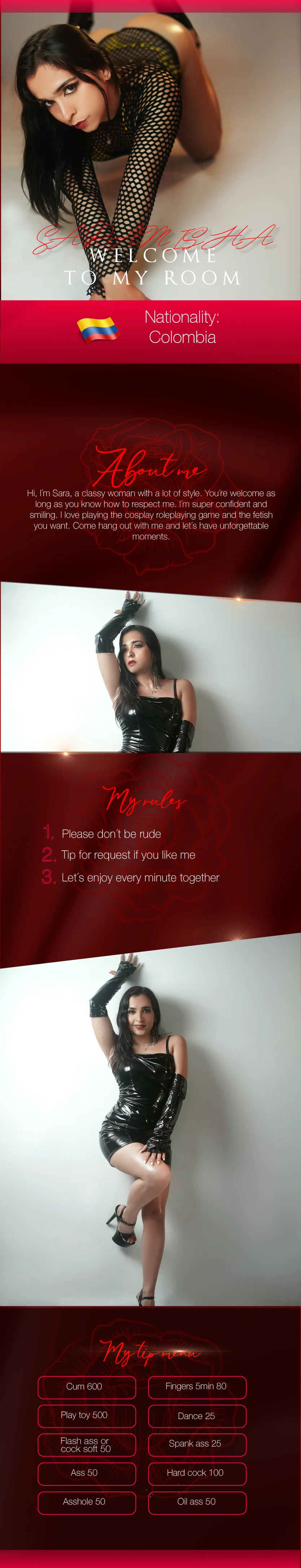 Show huileux, Dance érotique, Dirty Talk, Ahegao, Exhibitionisme, Sextoys, Fellation, Sous la douche, Twerk, Avale, Amazone, Orgasme, Seins nus, Tittyfuck, Fessée, Gode ou vibromasseur, Doggy style, Anulingus, Doigtage, Creampie, Strip-tease, Sextoys anaux, Accessoires pour tétons, Masturbation, Branlette, Fumeurs, Sexe anal, Giclées de sperme, Fisting, Gorge profonde